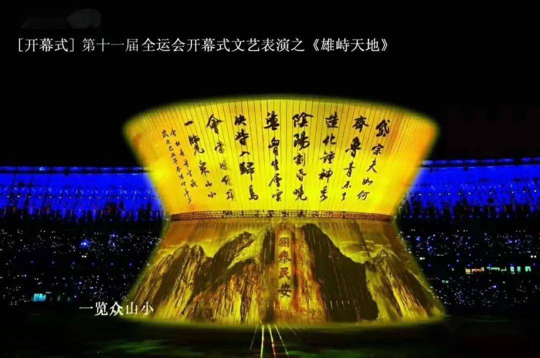 2009年10月16日在济南举办的第十一届全运会开幕式。整个开幕式,以“一山一水一圣人”为主线贯穿,用高悬的巨大碗幕作起承转合,展现了齐鲁大地山水雄伟秀美与源远流长、底蕴深厚的儒家文化, “岱宗夫如何?齐鲁青未了……会当凌绝顶,一览众山小。”由著名朗诵家方明朗诵张仲亭先生精心创作的书法作品杜甫《望岳》诗篇,给全国电视观众的留下深刻印象。全运会开幕式,把杜甫的《望岳》一诗从先秦以来迄今数千年来描绘吟咏泰山之浩量的诗词歌赋楹联中挑选出来,在大碗幕上展示得如此完整,清晰,璀璨夺目,这就高度点明《望岳》诗与泰山文化之间重要而密切的关系,强调《望岳》诗对于中华泰山文化的涵盖性与代表性。而张仲亭先生书写的《望岳》书法作品,却是在他本人毫不知情的情况下被全运会组委会全部选用的,这在当今书坛是难能可贵的。这也由此注定张仲亭先生与泰山的情缘,他深受启发和激励,而后更加力行时代担当,坚定以自己的书法来宣传泰山文化和中华传统文化的信心。