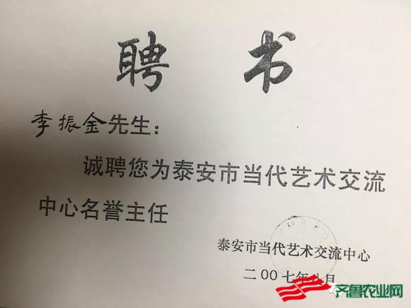 图为李振金先生2007年被评为泰安当代艺术交流中心主任