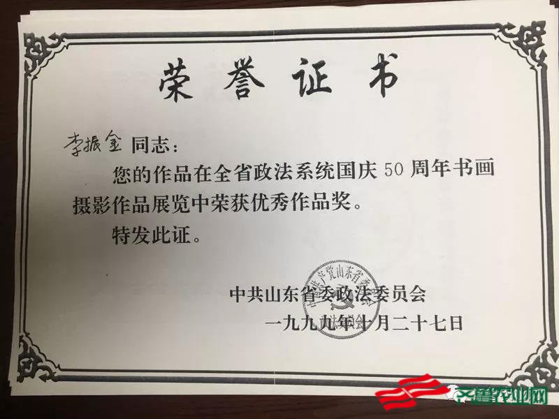 图为李振金同志在全省政法系统国庆50周年书画摄影作品展览中获奖!