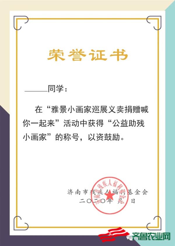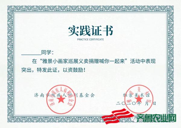 拍出作品后,现场济南市残疾人福利基金会秘书长将为孩子颁发公益助残小画家证书、校外实践证书和爱心礼品。
